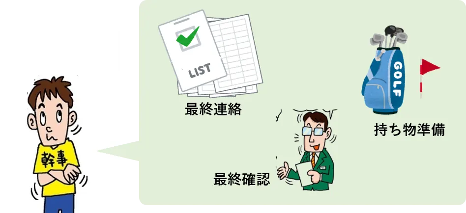 コンペ当日が近づいてきた幹事さんへ。ゴルフコンペの1週間前~前日にかけて幹事さんがやっておく仕事は、①参加者への最終案内 ②ゴルフ場への連絡 ③緊急事態の想定 ④持ち物準備 の4つです。これらを行っておけば、当日のトラブルを防ぎ、スムーズにゴルフコンペを進行することができます。具体的にやるべきことや注意点を分かりやすく解説します。