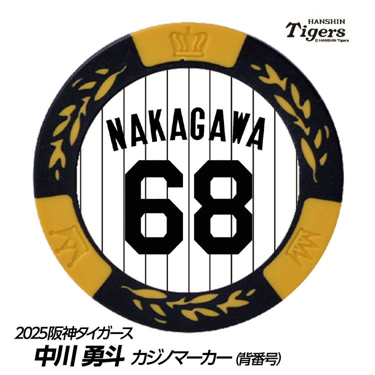 阪神タイガース、中川勇斗選手のゴルフ用カジノチップマーカー。表面は各選手の背番号、裏面は90周年ロゴのデザインです。阪神タイガース承認。