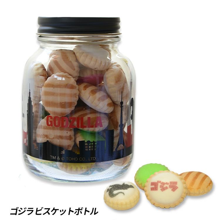ゴジラのボトル入りビスケット。一部のビスケットにゴジラがプリントされています。ガラスのボトル入りで食べた後も使えます。ゴルフコンペの景品・賞品や参加賞、記念品や粗品、スヌーピー好きの方へのプチギフトやプレゼントにぴったり。大人から子供まで喜ばれるアイテムです。