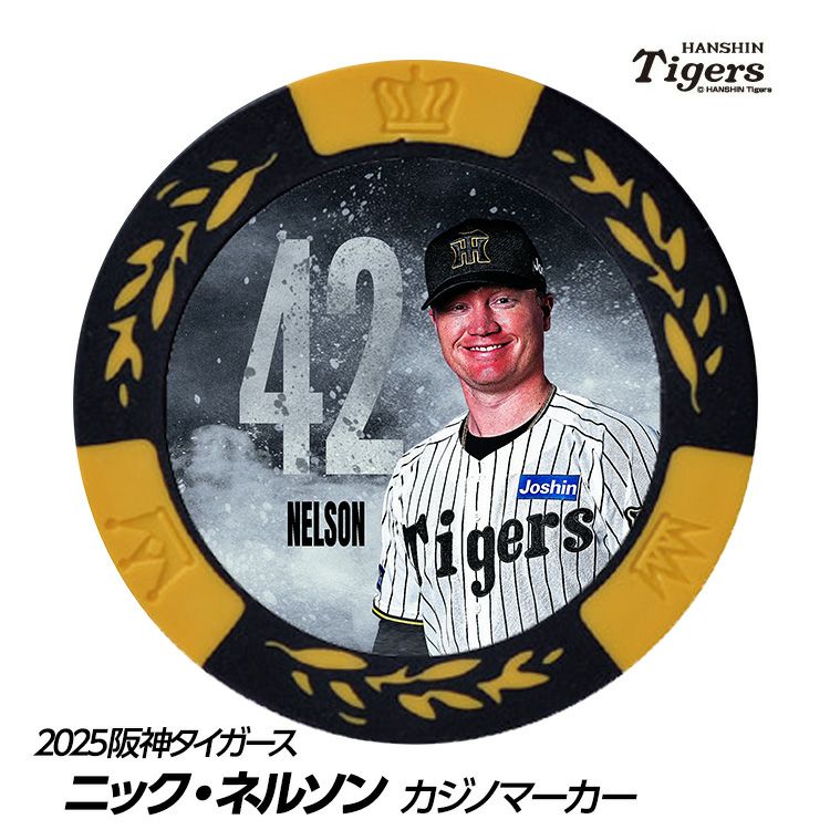 阪神タイガース、ニック・ネルソン選手のゴルフ用カジノチップマーカー。表面は各選手、裏面は90周年ロゴのデザインです。阪神タイガース承認。