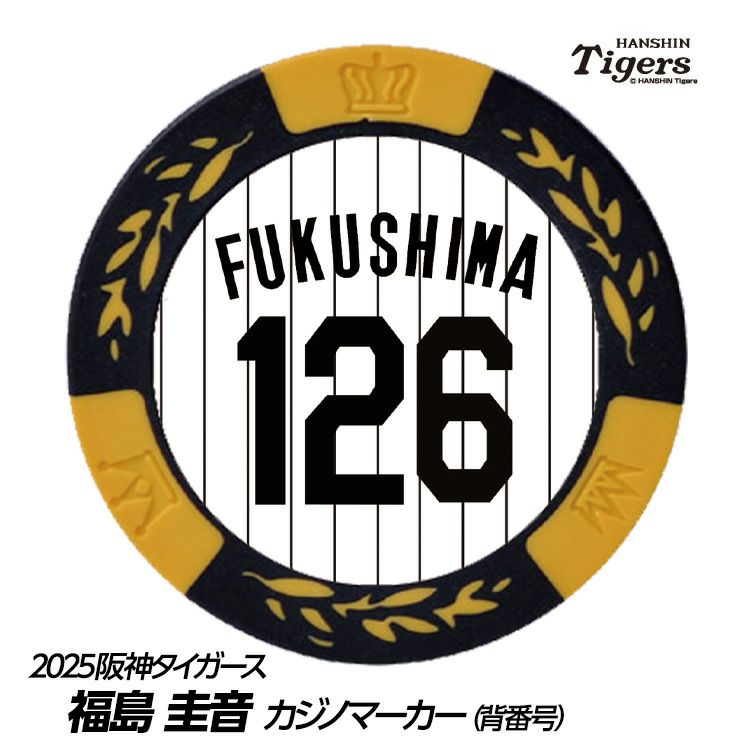 阪神タイガース、福島圭音選手のゴルフ用カジノチップマーカー。表面は各選手の背番号、裏面は90周年ロゴのデザインです。阪神タイガース承認。