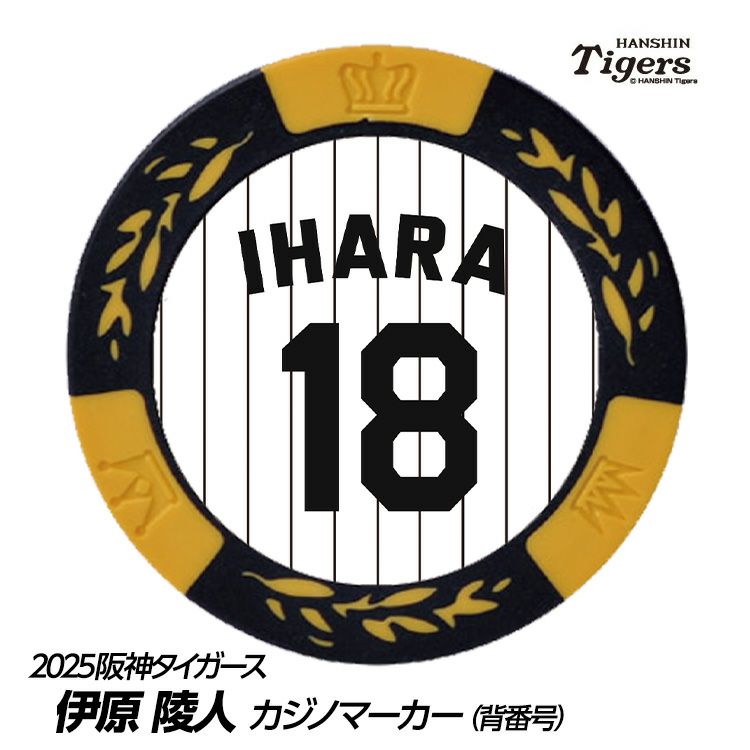 阪神タイガース、伊原陵人選手のゴルフ用カジノチップマーカー。表面は各選手の背番号、裏面は90周年ロゴのデザインです。阪神タイガース承認。