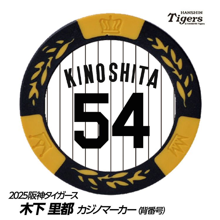 阪神タイガース、 木下里都選手のゴルフ用カジノチップマーカー。表面は各選手の背番号、裏面は90周年ロゴのデザインです。阪神タイガース承認。