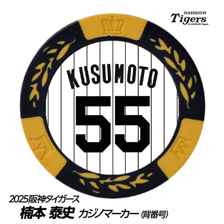 阪神タイガース、楠本泰史選手のゴルフ用カジノチップマーカー。表面は各選手の背番号、裏面は90周年ロゴのデザインです。阪神タイガース承認。