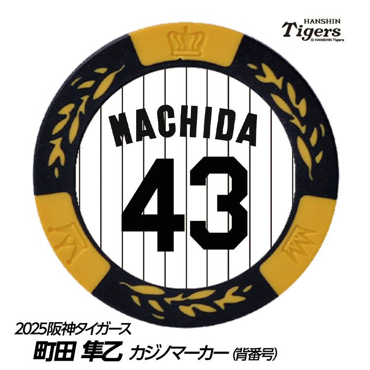 阪神タイガース、町田隼乙選手のゴルフ用カジノチップマーカー。表面は各選手の背番号、裏面は90周年ロゴのデザインです。阪神タイガース承認。