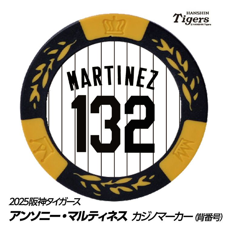 阪神タイガース、アンソニー・マルティネス選手のゴルフ用カジノチップマーカー。表面は各選手の背番号、裏面は90周年ロゴのデザインです。阪神タイガース承認。