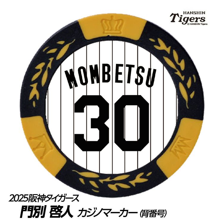 阪神タイガース、門別啓人選手のゴルフ用カジノチップマーカー。表面は各選手の背番号、裏面は90周年ロゴのデザインです。阪神タイガース承認。