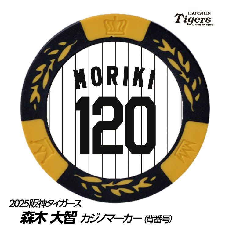 阪神タイガース、森木大智選手のゴルフ用カジノチップマーカー。表面は各選手の背番号、裏面は90周年ロゴのデザインです。阪神タイガース承認。