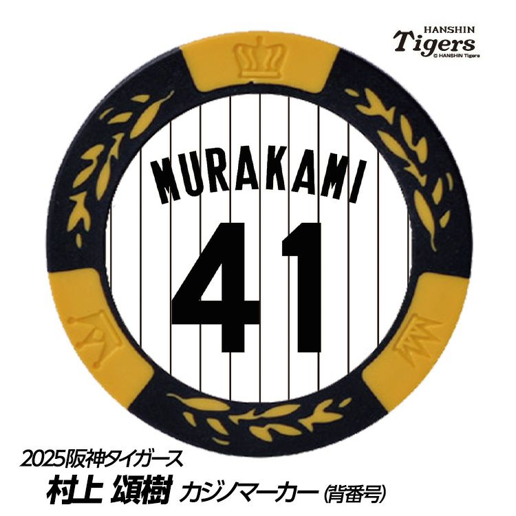 阪神タイガース、村上頌樹選手のゴルフ用カジノチップマーカー。表面は各選手の背番号、裏面は90周年ロゴのデザインです。阪神タイガース承認。