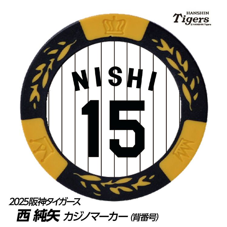 阪神タイガース、西純矢選手のゴルフ用カジノチップマーカー。表面は各選手の背番号、裏面は90周年ロゴのデザインです。阪神タイガース承認。